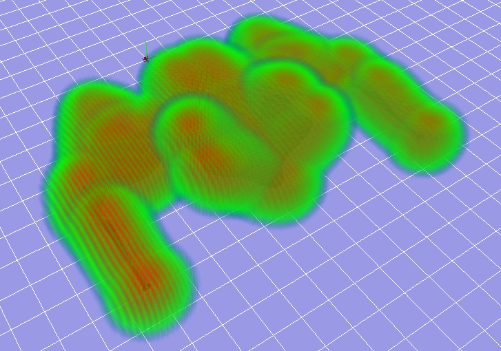 3D Distance Field of Plane model (58k polygons): distance to the surface is color coded, increasing from red to green and to blue. Time taken to compute the distance field with resolution 217x219x212 using our algorithm is 0,03 sec. |